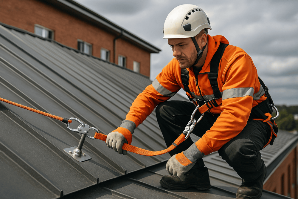 Принцип прост: не дать работнику выйти в опасную зону. Строп фиксируется так, чтобы человек не мог подойти к краю. Такой вариант незаменим для осмотров, профилактических задач или ремонта в центре крыши.